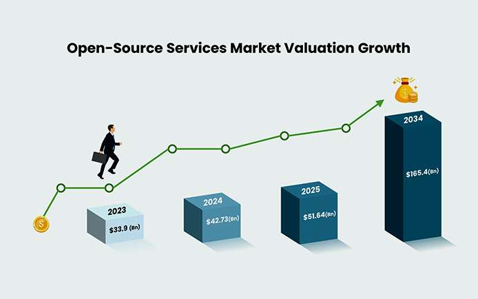 The global market for open-source services was estimated by Allied Market Research to be worth $33.9 billion in 2023. The Business Research Company estimates that by the end of 2025, the global market for open-source services would have grown from $42.73 billion in 2024 to $51.64 billion. At this pace, it is expected to increase at a CAGR of 16.8% and reach $165.4 billion by 2034. This increase is a reflection of businesses’ increasing reliance on open-source consultants to handle adoption, integration, and optimization issues.To reduce the cost of enterprise software while preserving dependability and performance, businesses are increasingly looking for open-source support.