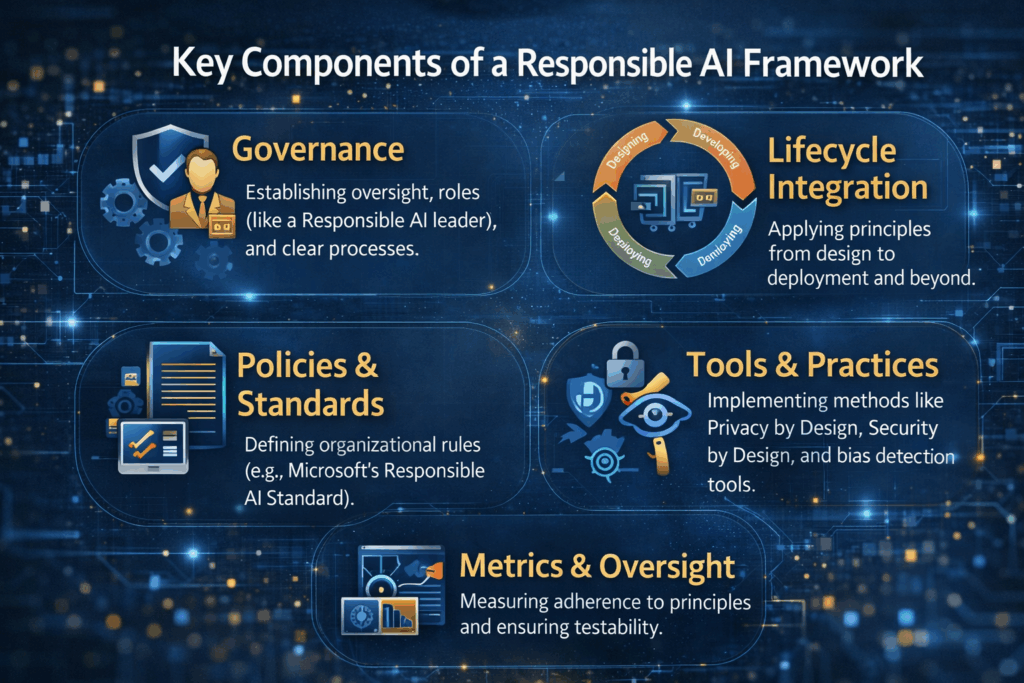 - Policies & Standards: Defining organizational rules (e.g., Microsoft’s Responsible AI Standard).